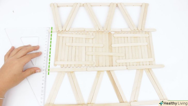 Визначтеся з розмірами поперечних опорних балок моста. візьміть лінійку або інший Вимірювальний інструмент і виміряйте ширину настилу. Вам необхідно підготувати балки, на які він повинен спиратися. Ці ж балки з'єднають між собою дві ферми моста. Тому довжина поперечних балок повинна враховувати як ширину настилу, так і товщину обох ферм.- Підготуйте поперечні опорні балки. якщо у вас є дерев'яні палички різних розмірів, ймовірно, вони вам знадобляться за тієї умови, що серед них є такі палички, які довші ширини настилу моста і товщини обох ферм. Якщо ви працюєте з лінійкою або іншим вимірювальним інструментом, зробіть наступне: