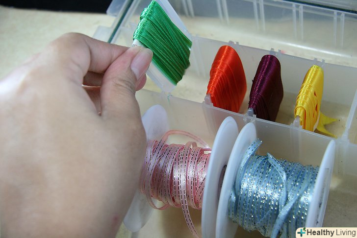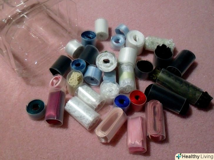 Візьміть контейнер для вишивальних ниток з пластиковими або картонними вставками. замість намотування на них ниток, намотайте на вставки стрічки. Цей метод підходить тільки для тонких і не дуже довгих стрічок. При цьому дещо незручно буде часто поповнювати стрічки.