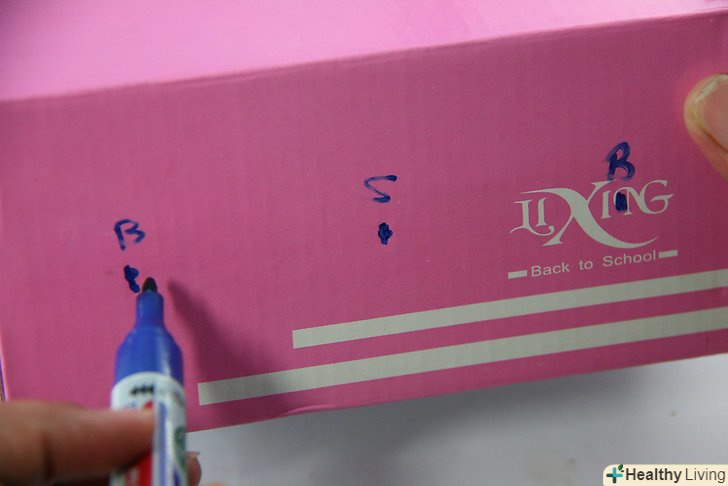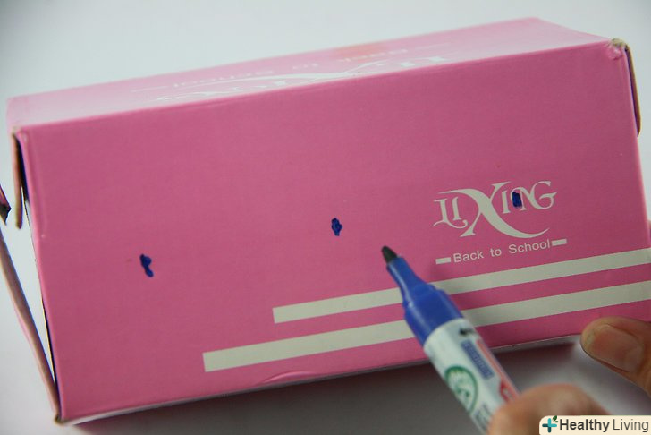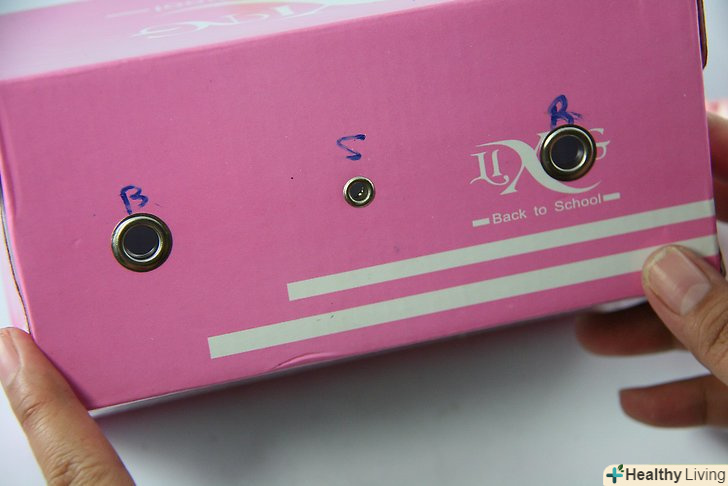 Розмітьте на коробці уздовж довгих сторін розташування всіх люверсів. місце отвору буде відповідати розташуванню стрічки в коробці, тому у вас все повинно бути продумано відразу.- Якщо ви в змозі укласти в коробку два ряди мотків стрічок, то розмітьте і зробіть отвори по обидва довгих сторонах коробки.