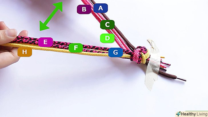 - Якщо ви віддаєте перевагу позначити нитки, щоб їх було простіше відстежувати, використовуйте буквене позначення A, B, C, D - E, F, G, H, де дефіс ("-") позначає проміжок між двома групами ниток. Візьміть нитку H і проведіть її під нитками G, F, E, D і C, уклавши між нитками B і C. новий порядок ниток буде таким: A, B, H, C, D - E, F, G.