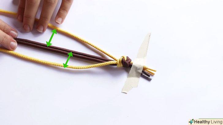- З одного кінця зв'яжіть нитки між собою. Зв'яжіть з одного кінця відрізки матеріалу, який ви будете використовувати в плетінні. Скористайтеся звичайним вузлом, включивши в нього всі чотири або вісім ниток, щоб закріпити їх.