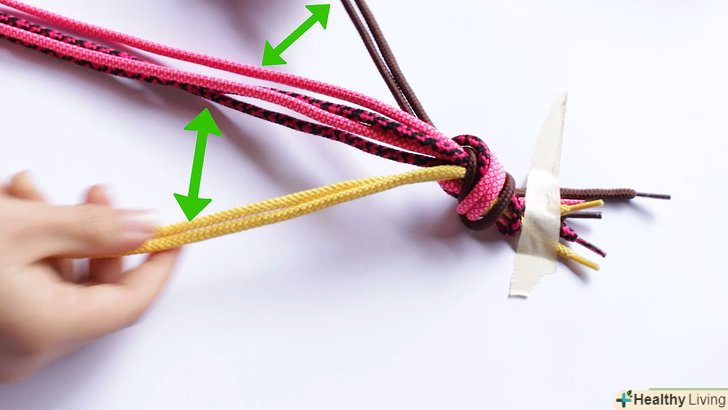 - Щоб отримати в плетінні двоколірні смуги, розташуйте всі чотири нитки одного кольору зліва (в лівій руці), а всі чотири нитки іншого кольору — справа (в правій руці). [3]
