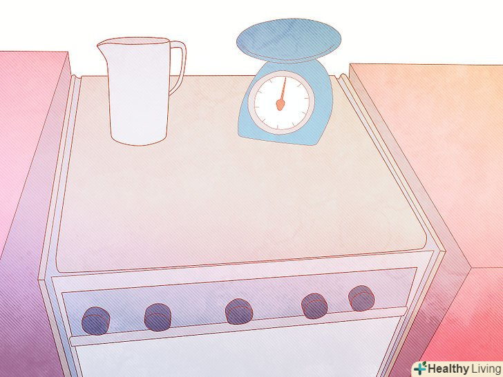 Поставивши ваги і глечик на обробну дошку під витяжкою, відміряйте воду в глечик і поставте біля ваг, весь час тримаючи під витяжкою.