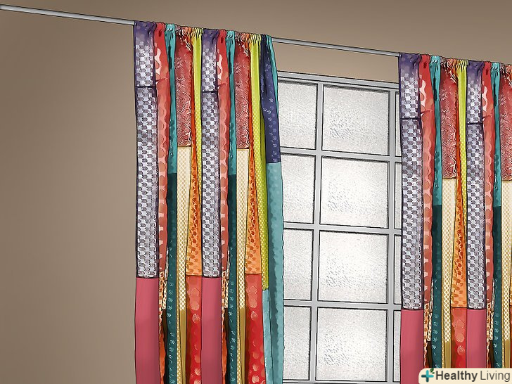 Зшийте фіранки. якщо вам подобається богемний стиль, то клаптеві фіранки можуть стати унікальним доповненням вашого домашнього декору. Спочатку виміряйте вже наявні у вас фіранки. Потім наріжте зі старого одягу багато квадратів однакового розміру. Чим більше буде різноманітності за кольором і візерунками клаптів, тим краще. Зшийте клапті в єдине полотно, відповідне розміру наявних у вас фіранок. [8]- Якщо у вас недостатньо тканини на повноцінні фіранки, то можна зробити короткий ламбрекен у верхній частині штор, щоб надати декору трохи сільського шарму.