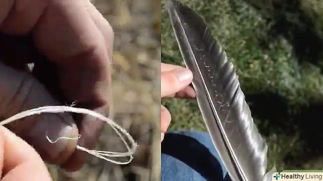 - Традиційно для кріплення пір'я використовується тонка бавовняна нитка, що прориває їх в протилежному їх росту напрямку таким чином, що з'являються просвіти в місцях прикріплення до древка. Якщо бажаєте, можете відтворити цей варіант кріплення. Якщо ви так і вирішили зробити, накручуйте нитку навколо пір'я так, щоб вона туго притискала їх до древка стріли, а потім приклейте нитку для фіксації.