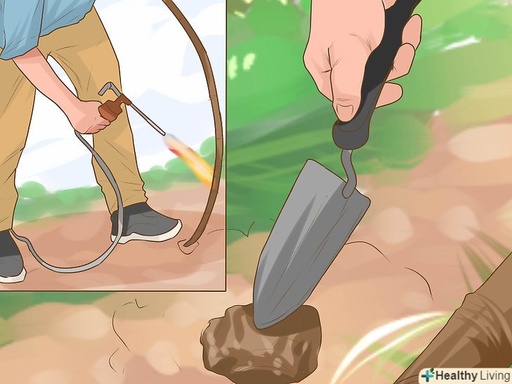 Підготуйтеся до вигинання жердини. у щільному грунті зробіть отвір глибиною 15-20 см, діаметром трохи більше, ніж товщина бамбука. Міцно тримаючи бамбук, почніть надавати йому потрібну форму.- Знову розігрійте бамбук пальником. Зосередьтеся на області, яка буде згинатися, постійно пересуваючи полум'я.