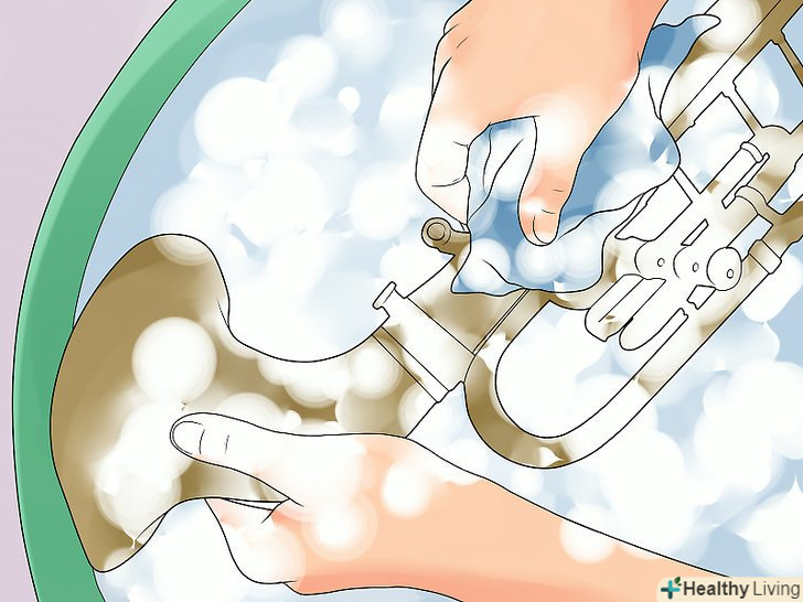 Почистіть латунь. помийте латунь з милом, щоб очистити метал від поверхневих забруднень на зразок масла і продуктів окислення. Якщо латунь покрита лаком, його потрібно буде зчистити ацетоном, розріджувачем лаку або розчинником.- Змивати лак можна тільки в рукавичках в провітрюваному приміщенні, особливо при роботі з розчинником.
