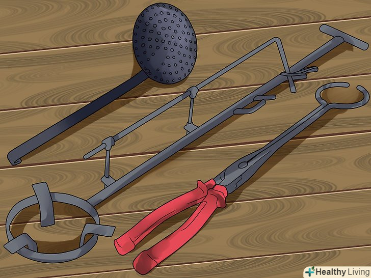 Зберіть все необхідне. вам будуть потрібні щипці, велика ложка і ливарний ківш. Сталеві щипці потрібні для того, щоб братися за тигель, поміщати його в піч і діставати звідти. Сталева ложка буде потрібно для видалення з поверхні шлаку. Ливарним ковшем утримують тигель на місці і нахиляють його, щоб вилити метал.- Якщо ви вмієте працювати зі зварюванням, ви зможете самі виготовити ці предмети з того, що знайдете.
