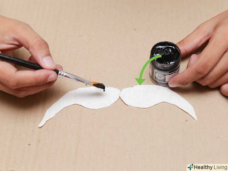 Фарбуйте вуса. візьміть для цього чорну фарбу. Покладіть тканинні вуса на непотрібний аркуш паперу. Повністю пофарбуйте вуса в чорний колір. [10]- Колір вусів можна вибрати на свій розсуд. Незважаючи на те, що в більшості випадків накладні вуса роблять чорними, вони також можуть бути коричневими або сірими. А якщо захочете, їм навіть можна надати який-небудь незвичайний колір, наприклад, жовтий або зелений.