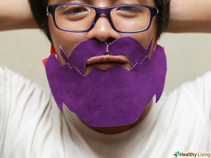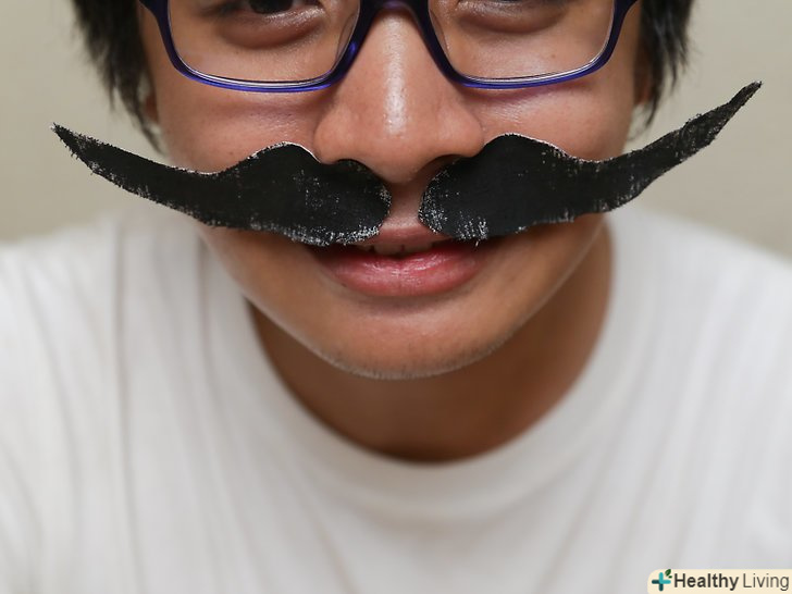 Приміряйте накладні вуса. прикладіть накладні вуса собі під ніс. Зв'яжіть кінці стрічок на потилиці, щоб зафіксувати вуса на обличчі. [6]- Цілком ймовірно, що кінці стрічок виявляться трохи довше необхідного. Обріжте надлишки стрічки, які залишаться висіти, коли ви прив'яжете вуса.