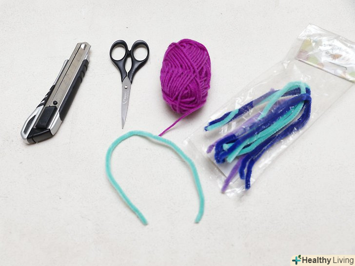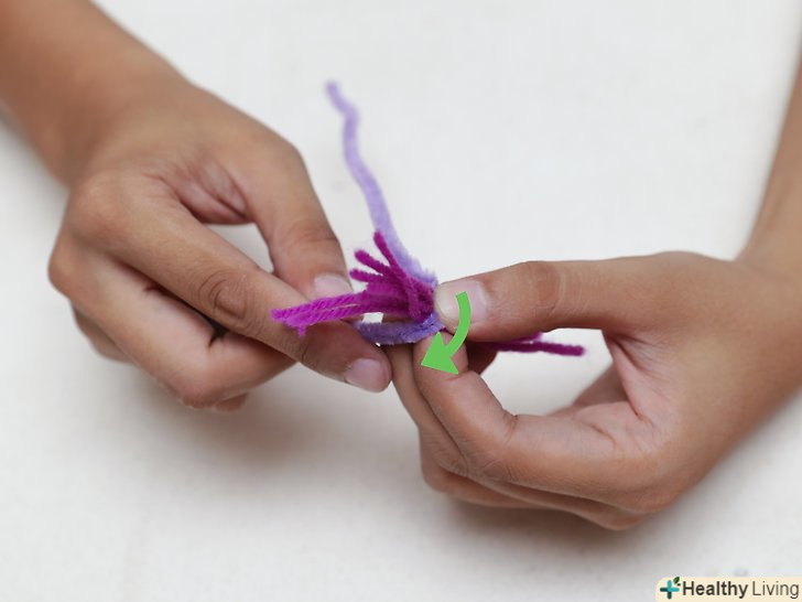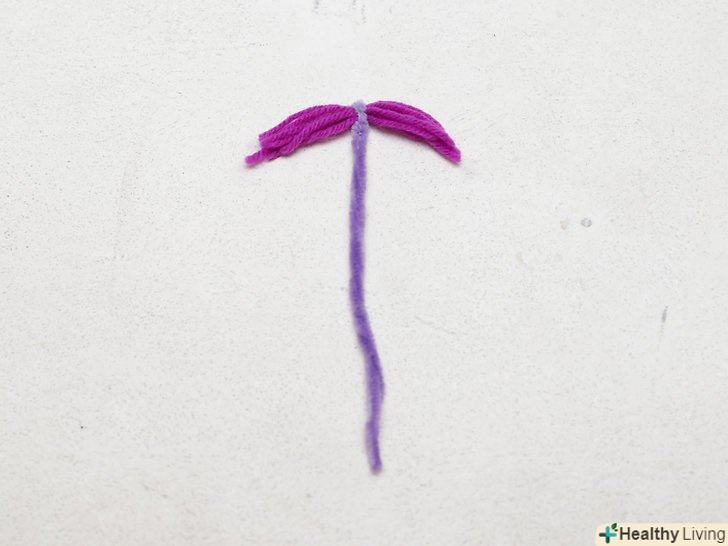 Скріпіть відрізки пряжі посередині за допомогою синельної дроту. просто обмотайте один кінець дроту навколо центральної частини майбутніх вусів. Таким чином синельная дріт скріпить посередині всі відрізки пряжі. [14]- В результаті, ваші матеріали придбають форму вусів. У центрі вуса будуть звужуватися, а по краях — розходитися в сторони.