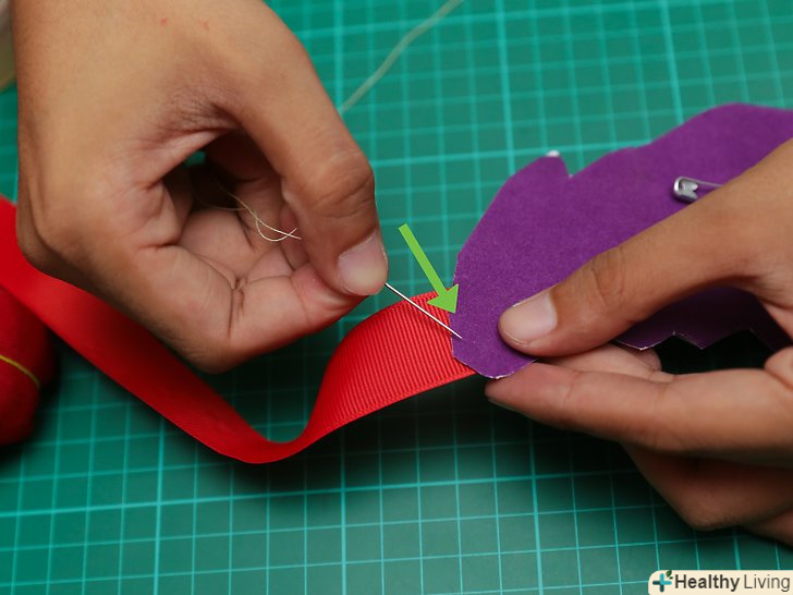 Зшийте фетрові деталі між собою по зовнішніх контурах. вставте нитку в голку і зшийте фетрові деталі між собою по зовнішньому контуру. Обов'язково прошийте ділянки зі стрічками. Стрічки повинні бути надійно закріплені на фетрі, коли ви закінчите роботу. [4]- Обов'язково використовуйте нитки в тон вашому фетру. Стежки не повинні занадто виділятися на загальному тлі готового виробу.