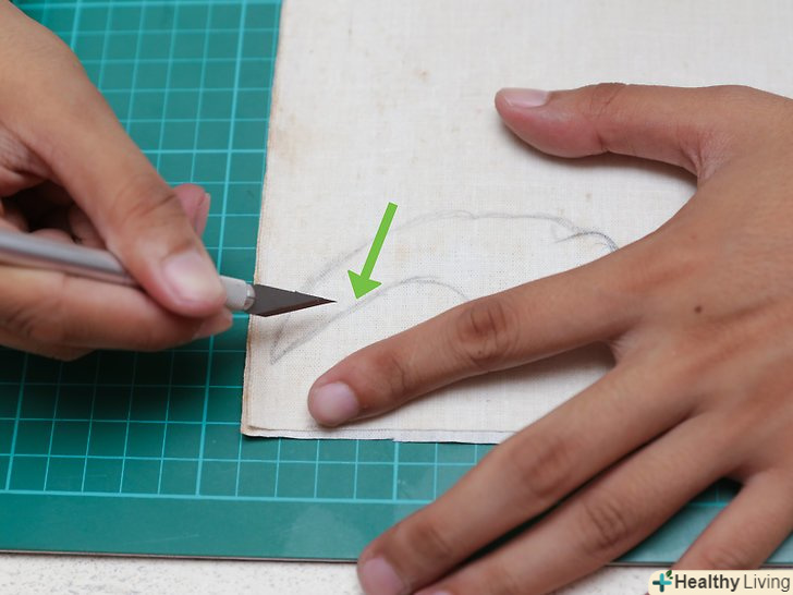 Виріжте вуса. для цього скористайтеся гострим ножем для виробів. Розріжте тканину по намальованим контурам. У вас на руках залишиться деталь з тканини у формі вусів. [9]- Коли будете працювати з ножем для виробів, обов'язково що-небудь підкладіть знизу під тканину, наприклад, стопку непотрібних паперів. Це необхідно, щоб не пошкодити стіл ножем.