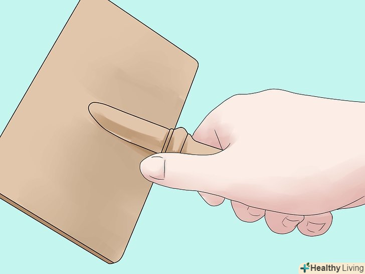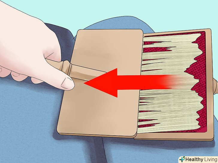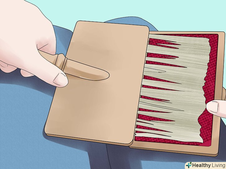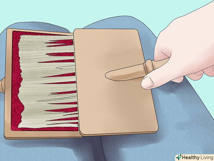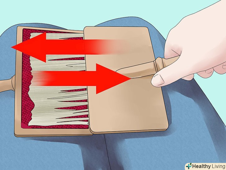 Сядьте так, щоб ваші коліна були вільні. покладіть заповнену чесальную машинку на ліве коліно шерстю вгору. Тримайте її ручку лівою рукою. [4]- Якщо ви лівша, поміняйте руку і коліно.