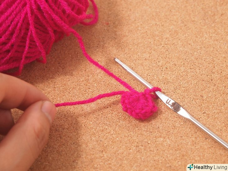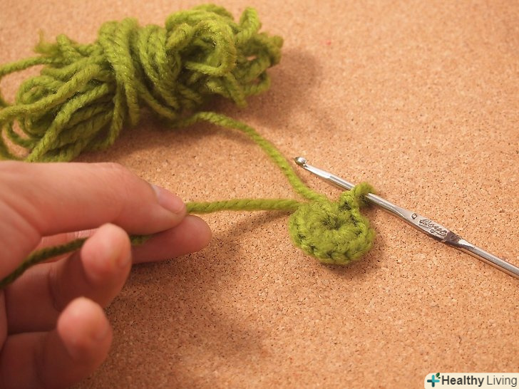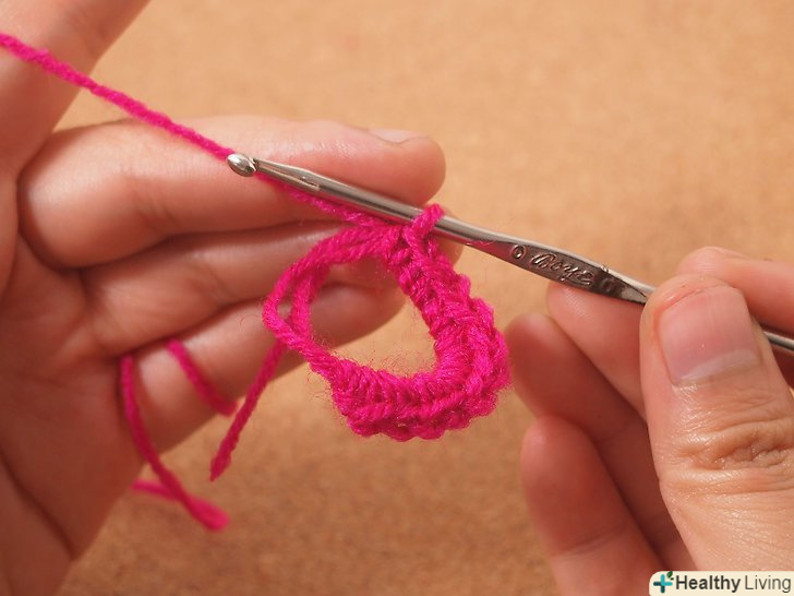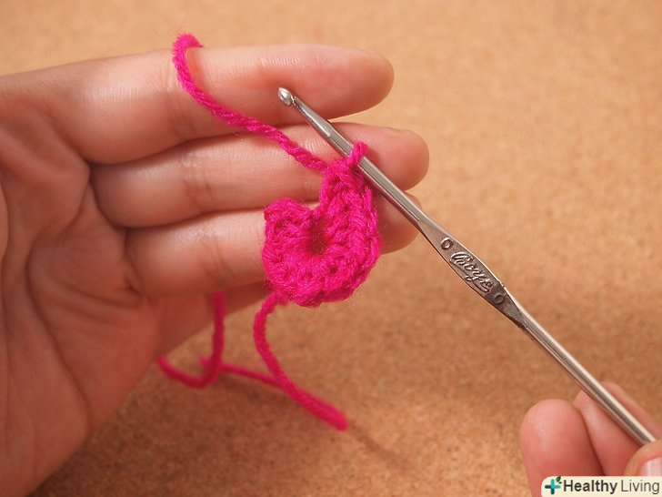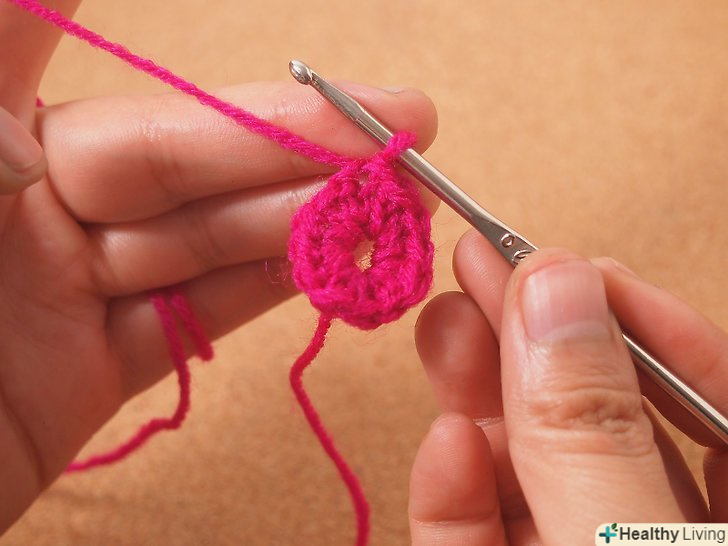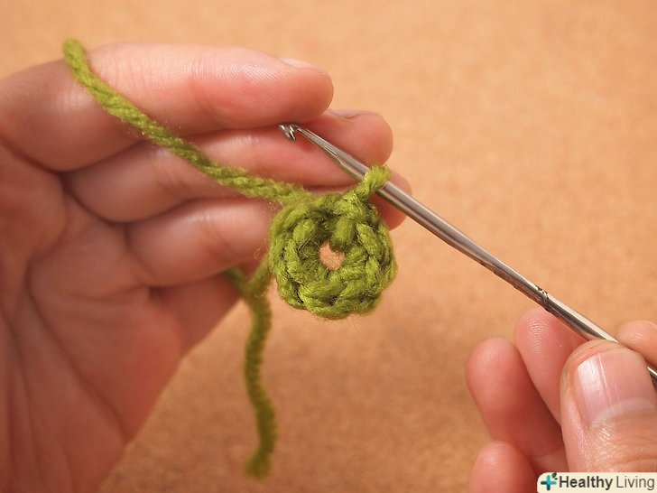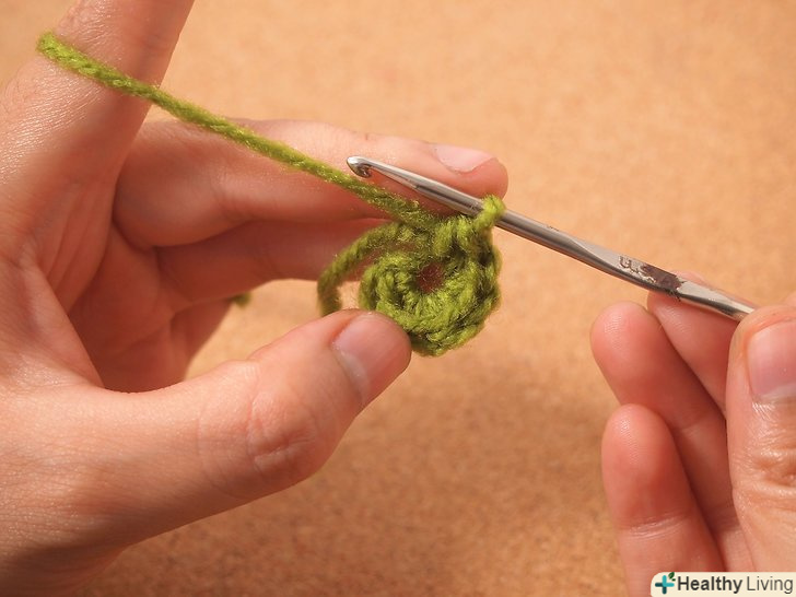 Пров'яжіть шість стовпчиків без накиду в другу від гачка петельку. [5] Петельки потрібно пров'язувати в другу від гачка петельку або, іншими словами, в найпершу створену вами петлю. Сюди вам потрібно провязать шість стовпчиків без накиду.- Для того щоб зв'язати стовпчик без накиду, введіть гачок в потрібну петлю, захопіть робочу нитку і простягніть її. Потім знову захопіть робочу нитку і протягніть її через обидві петельки, розташовані на гачку. У вас вийшов стовпчик без накиду.