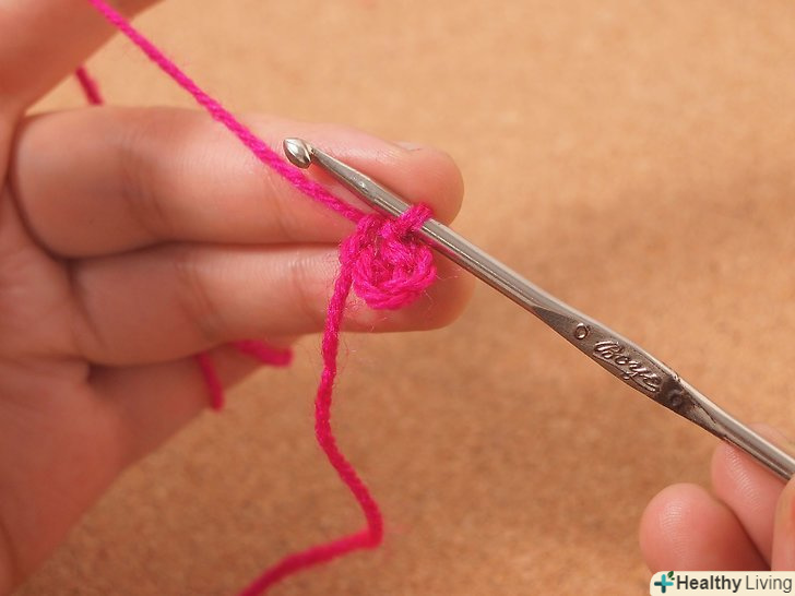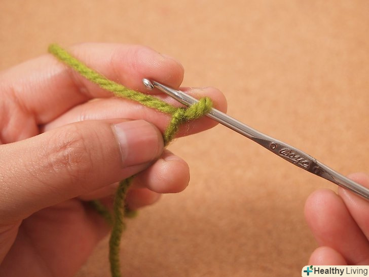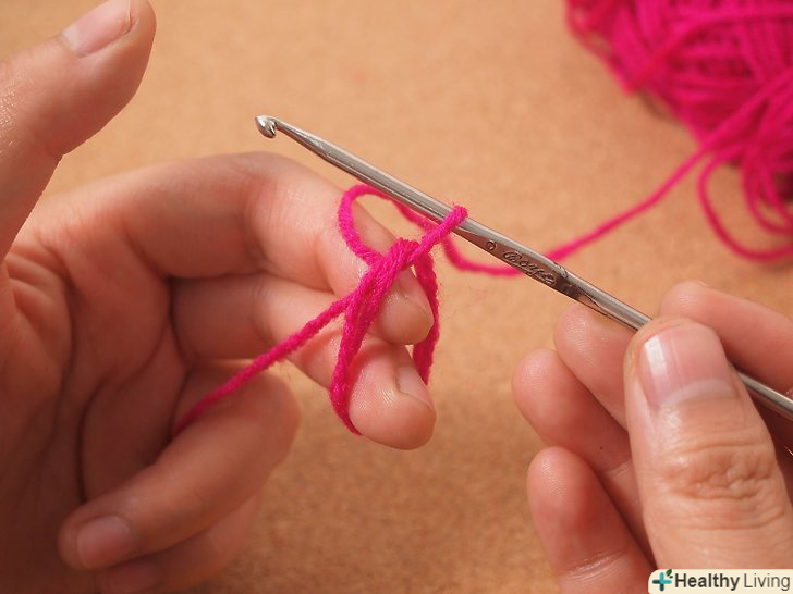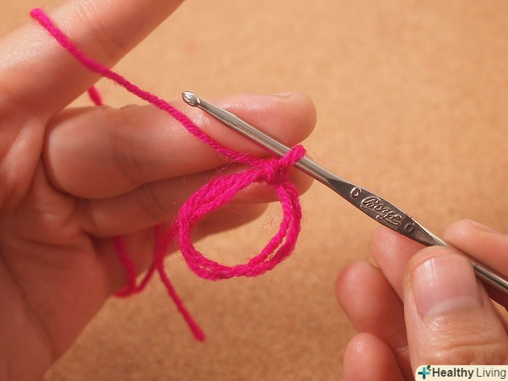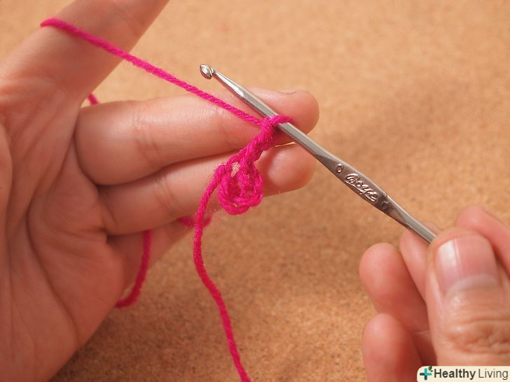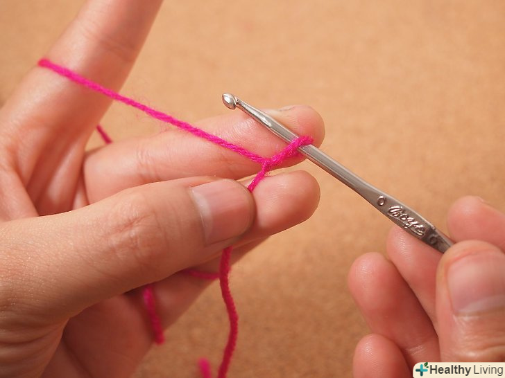 Зробіть міцний вузол. оберніть пряжу навколо вказівного пальця один раз. Так, щоб хвостик і робоча нитка перехрестилися. Підчепивши гачок під робочу нитку, обгорнуту навколо пальця, захопіть ділянку від хвостика і простягніть його під робочою ниткою. Притримуючи хвостик, зніміть петельку з пальця і потягніть за хвостик і петелька затягнеться на гачку.- Цей перший вузол можливо затягувати або розслабляти, в той час як наступні петлі мають постійний розмір, тому важливо петельки в'язати щільно і рівно.
