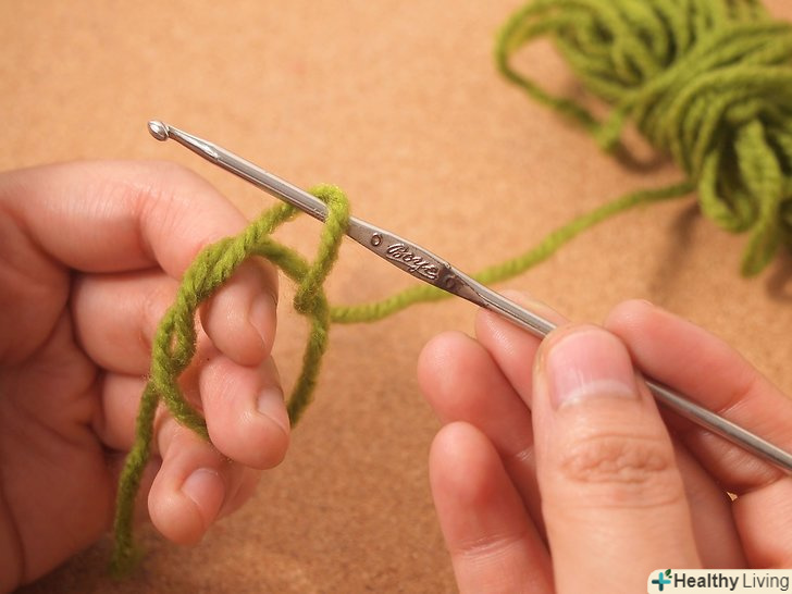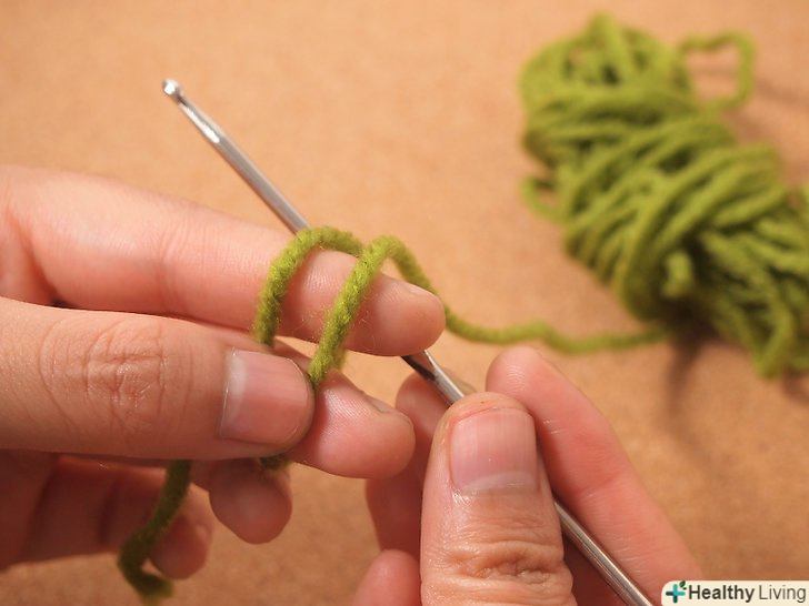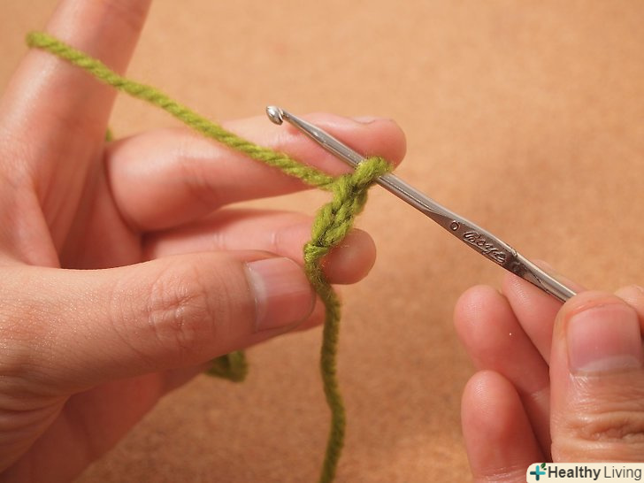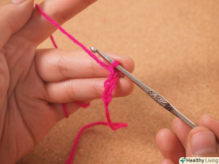 Зробіть початковий ланцюжок. захопіть робочу нитку і протягніть її через петельку, наявну на гачку.- Якщо ви в'яжете стовпчиками без накиду вам буде потрібно одна повітряна петля підйому, дві для напівстовпчиків з накидом, дві або три для стовпчика з накидом і чотири для стовпчика з двома накидами. Для того щоб зв'язати петлі підйому захопіть робочу нитку і простягніть її через петельку на гачку, - це дає вам одну повітряну петлю.