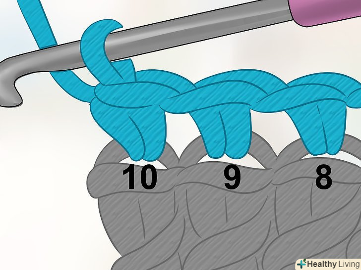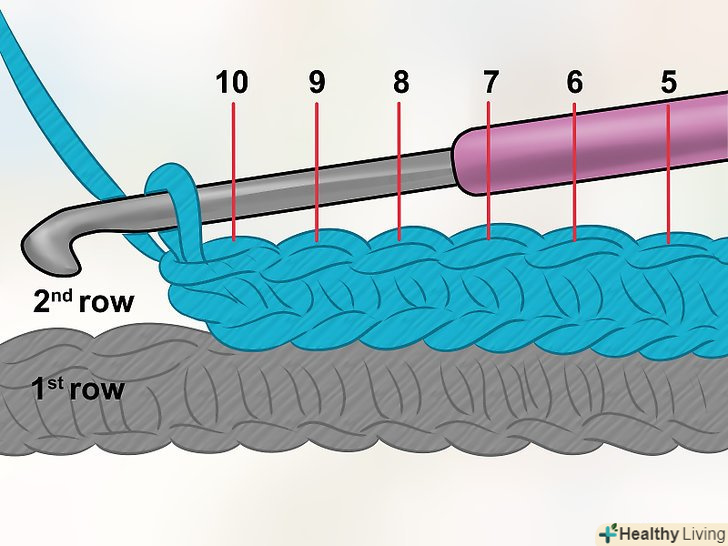 Тепер працюйте з другим рядом. зробіть ще 10 стібків.- Щоб зробити один стібок, вставте гачок ззаду другої петлі. У цей момент на гачку має бути 2 петлі. Простягніть нитку через вийшла ланцюжок. Потім знову потрібно взяти 2 петлі на гачок і знову провести їх через 2 петлі. Таким чином, у вас вийдуть окремі стібки.