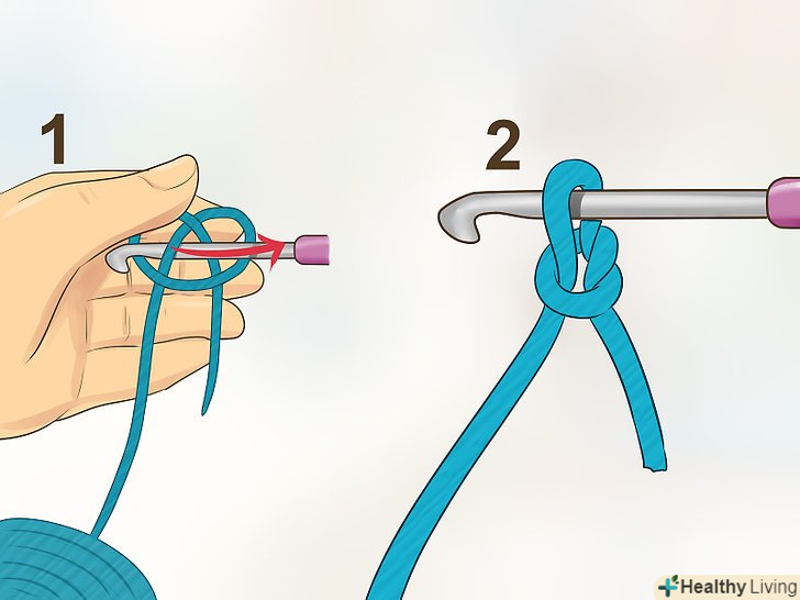 Зробіть ковзний вузол, потім зробіть петлю. вільний кінець повинен бути близько 15 см.вільний кінець повинен висіти позаду петлі. Вставте в'язальний гачок в петлю і витягніть вільний кінець через петлю на зворотну сторону. [3]