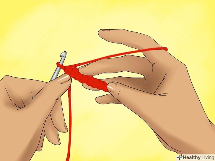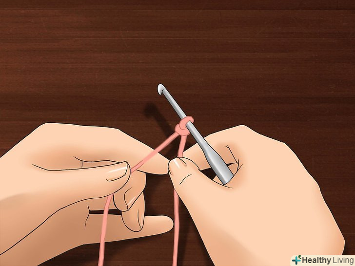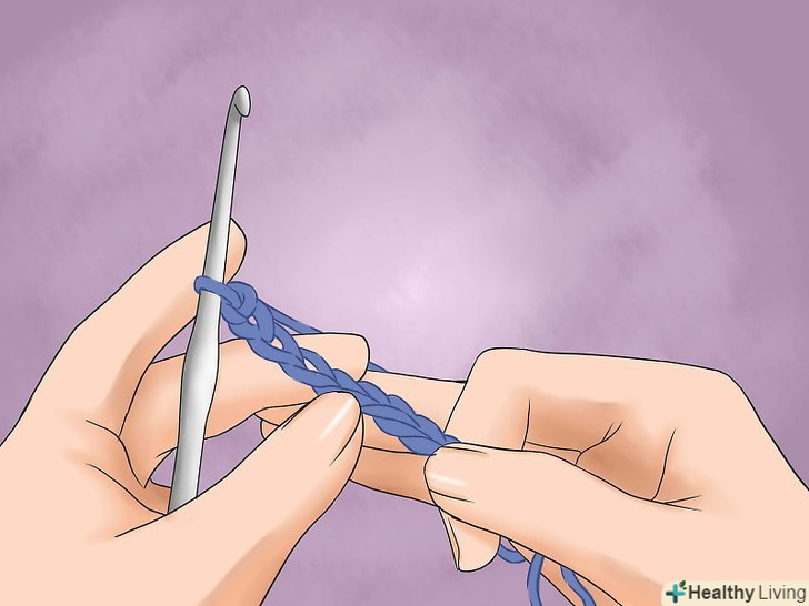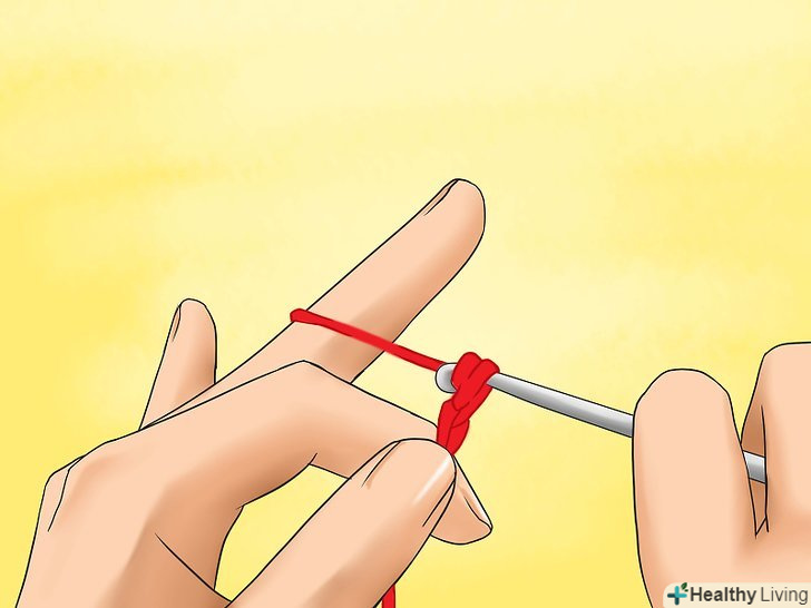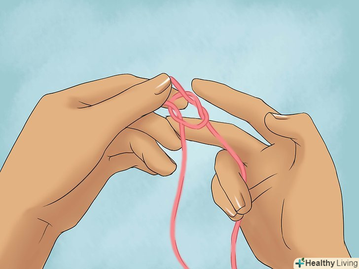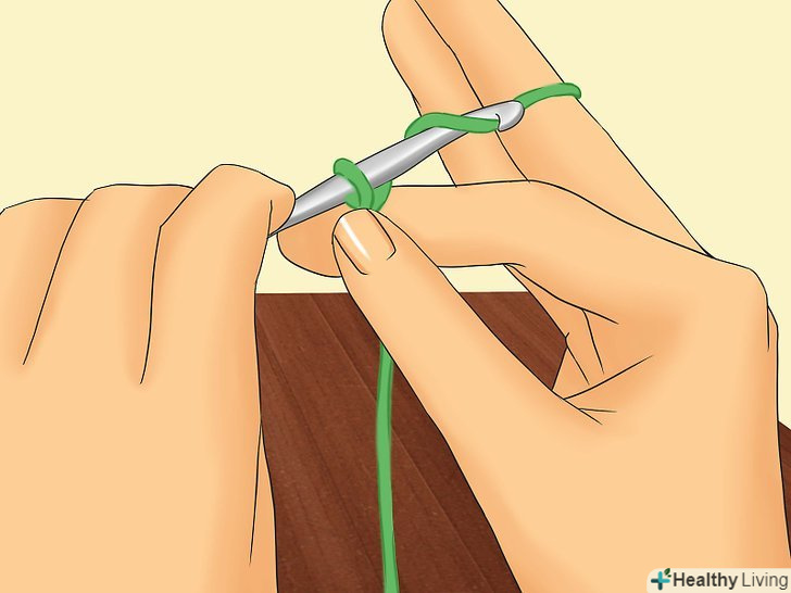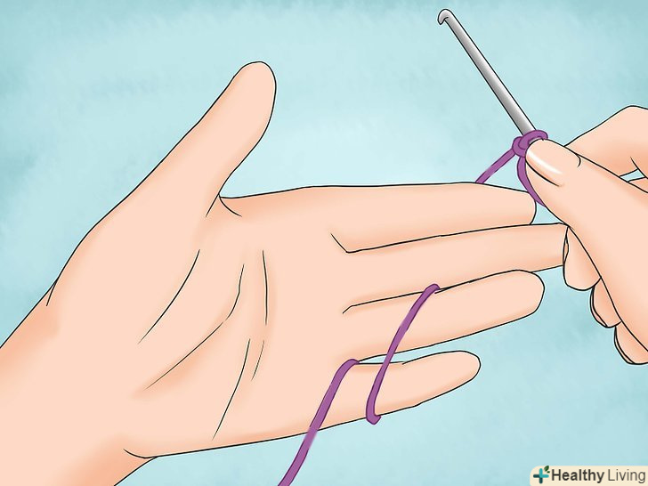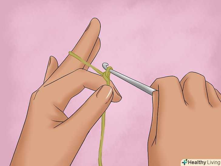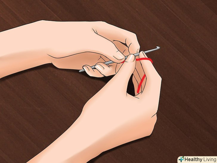 Гачком подденьте нитку. захоплюючи нитку гачком, обертайте його за годинниковою стрілкою, щоб пряжа обмотувалася навколо нього.- Якщо вам важко захопити нитку, тримайте першу петлю між великим і вказівним пальцями недомінантної руки, щоб краще натягнути нитку, і спробуйте знову.