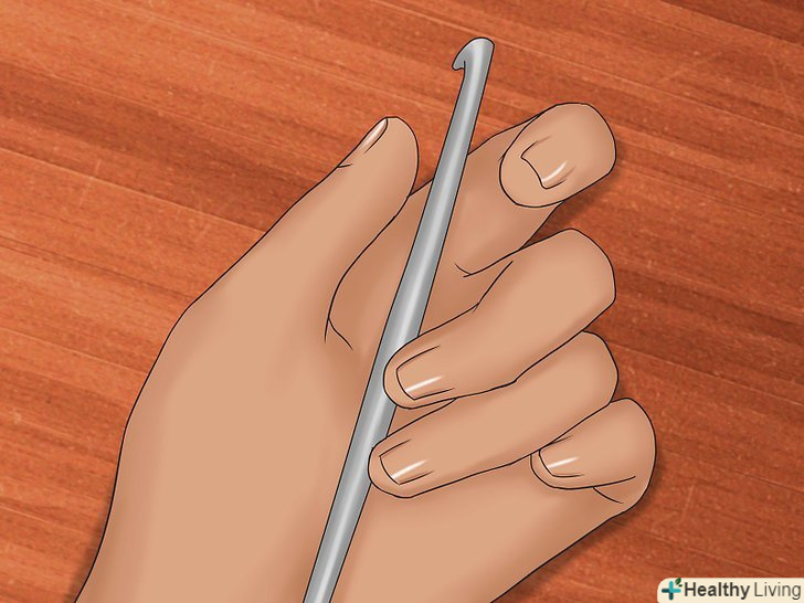 Тримайте гачок у правій (якщо ви правша) або лівій (якщо лівша) руці. Тримайте його, як олівець або ніж, так, щоб його загнутий кінчик дивився вниз і був спрямований на вас.- Для того, щоб тримати гачок, як олівець, поверніть долоню боком і затисніть разом великий, середній і вказівний пальці. Тримайте гачок цими пальцями так, щоб він зліг стирчав над їх кінчиками.
