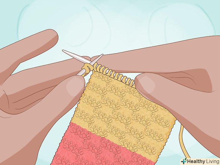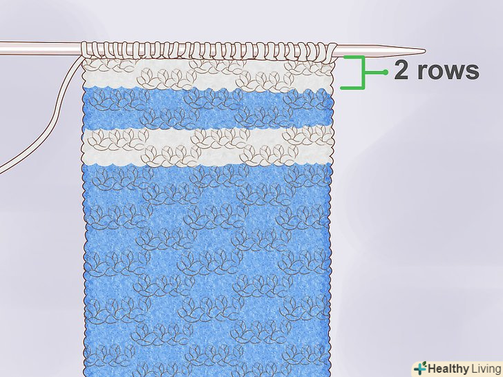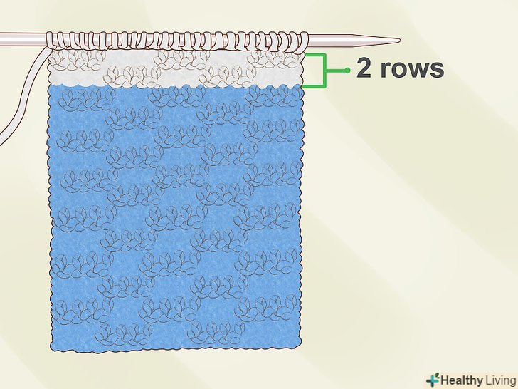 Пров'яжіть два ряди. використовуйте той же тип в'язки, яким в'язали першу смугу: панчішний або хустковий. Не забудьте залишити на початку ряду хвостик пряжі довжиною близько 10-15 см.