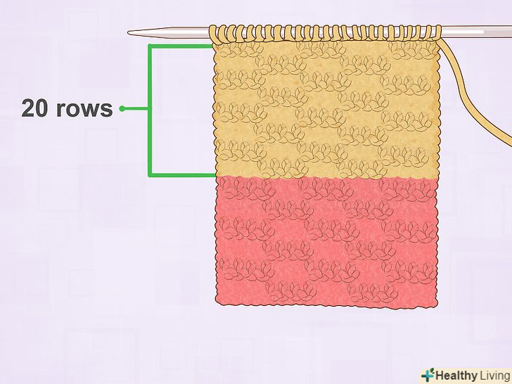 Пров'яжіть 20 рядів другим кольором. знову ж таки, використовуйте або панчішну, або хусткову в'язку. При цьому стиль в'язки повинен збігатися з тим, який ви вибрали з самого початку для першого кольору.
