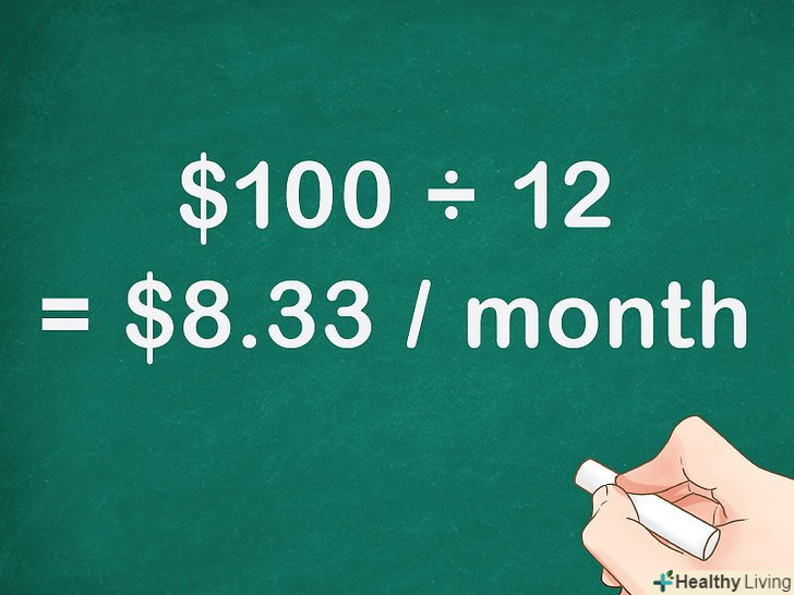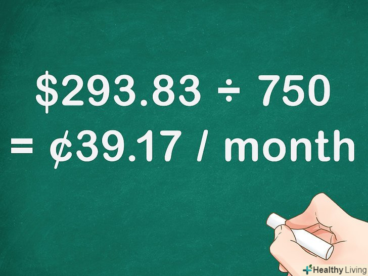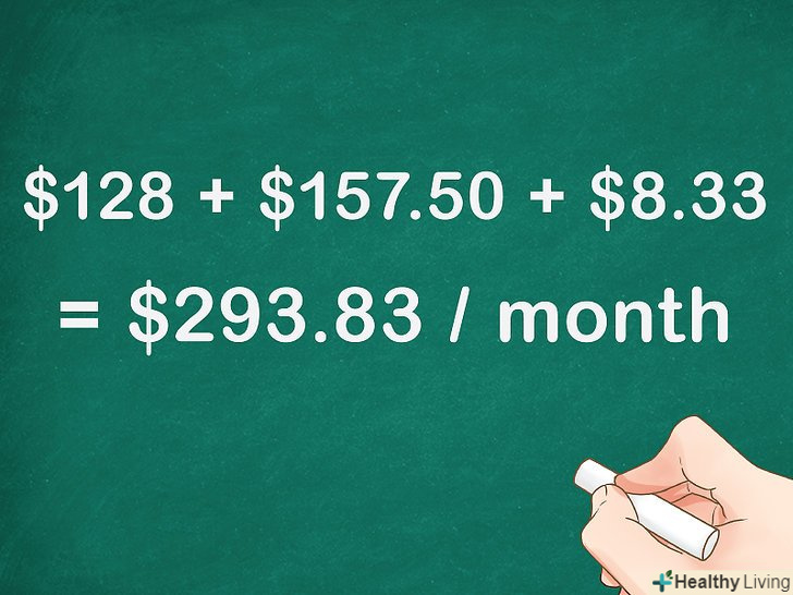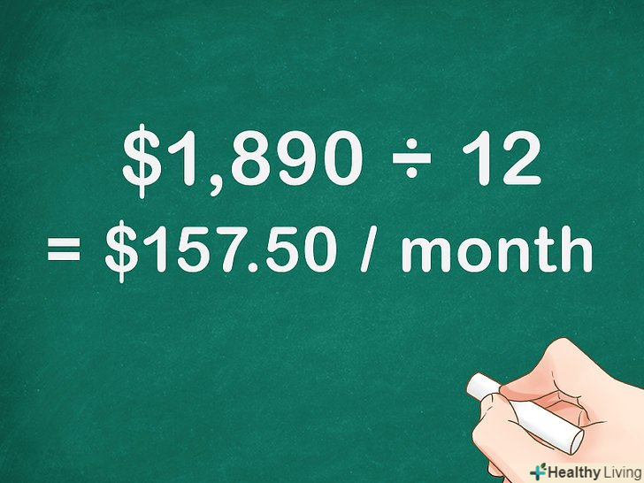 Підрахуйте, скільки ви витратили за рік на страховку, заміну масла, шин, інше обслуговування, ремонт автомобіля і страховку.розділіть загальну суму на 12, щоб отримати витрати на місяць. Якщо загальна сума, наприклад, $1 890 за рік, тоді витрати на місяць на обслуговування, ремонт і страховку становитимуть $157,50.
