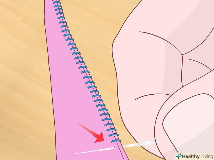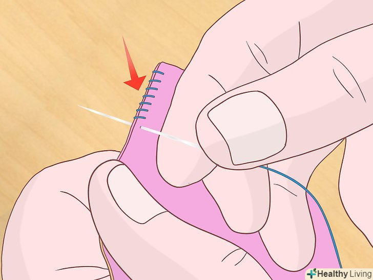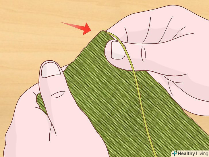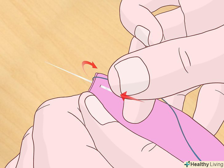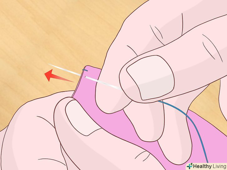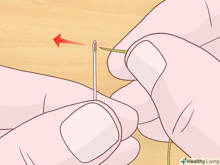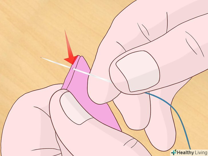 Всуньте нитку в голку. всуньте вільний кінець нитки в вушко голки. Вам не потрібно пов'язувати між собою обидва кінці нитки. Витягніть нитку таким чином, щоб з голкового вушка звисав її кінчик довжиною 7,5–10 см.це необхідно, щоб голка залишалася на нитки і не зісковзувала з неї під час роботи.- Також при роботі вам буде потрібно стежити за довжиною неробочого кінця нитки. Якщо він стане занадто коротким, витягніть його через вушко голки, щоб не дозволити голці зіскочити. Ну а якщо голка все-таки зіскочить під час роботи, просто знову всуньте нитку в її вушко.