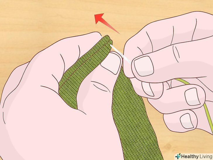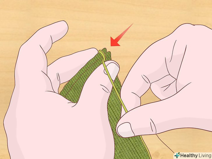 Зав'яжіть вузол в кінці шва. повторно проведіть голку через останню прошиту пару петель в тому ж напрямку. Протягніть голку в утворену ниткою петлю, щоб зав'язати вузол. [15]- Вільний кінчик нитки закріпіть під петлями на виворітній стороні в'язання, щоб заховати його.