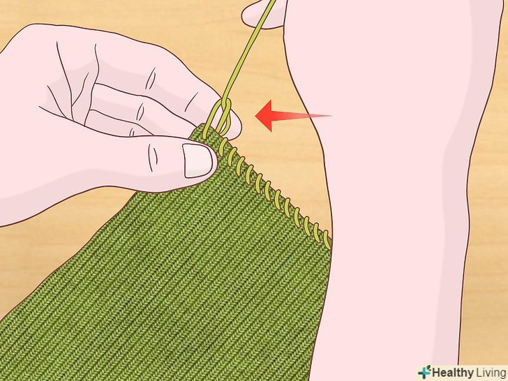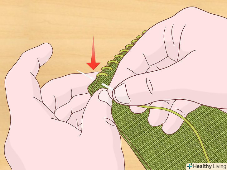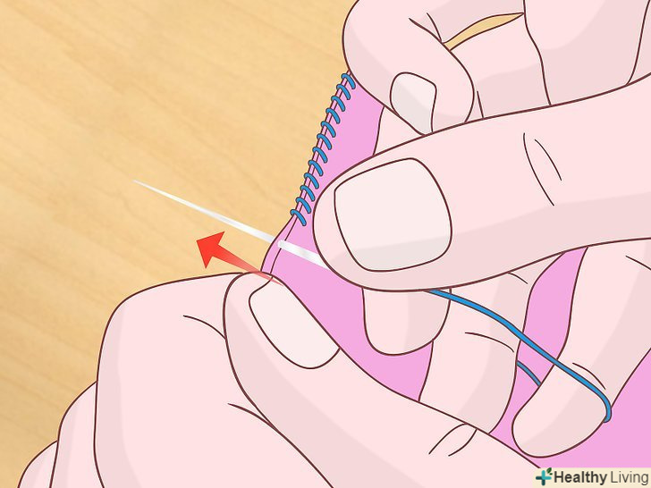Виконайте стібок через край на тих же самих петлях. ще раз проведіть голку через петлі в цьому місці в тому ж напрямку. Затягніть нитку, щоб утворити надійний вузол, що утримує деталі разом. [11]- Нитка слід затягувати досить туго, щоб деталі щільно прилягали один до одного. Однак не потрібно затягувати нитку занадто сильно, щоб під час роботи на шві не утворювалися збірки і не виникали інші деформації.