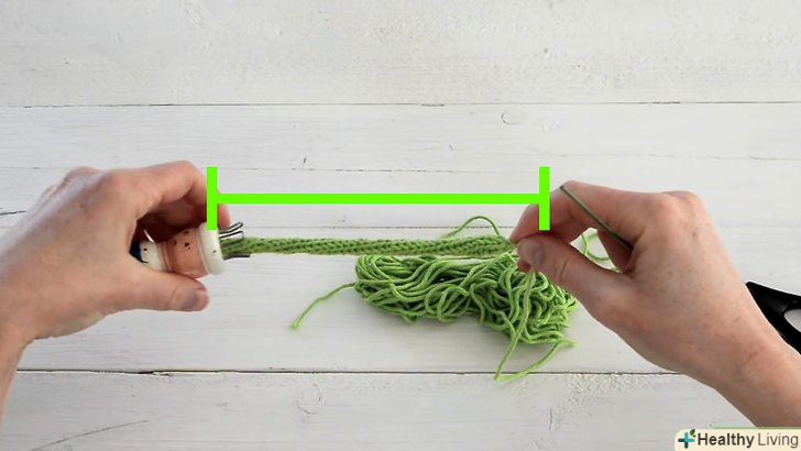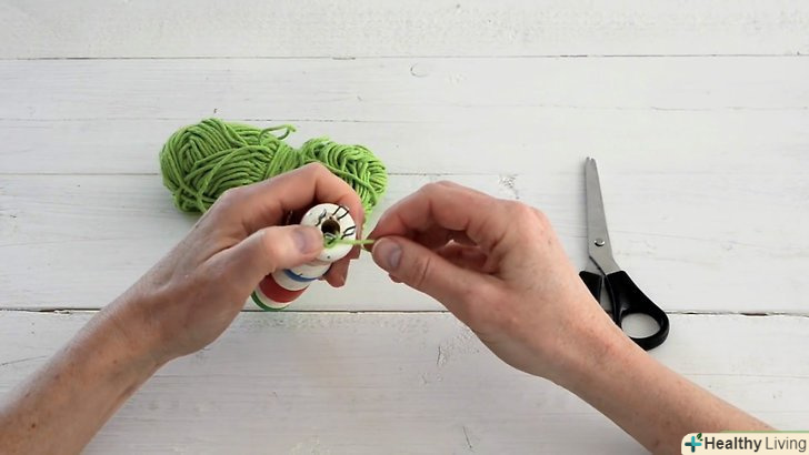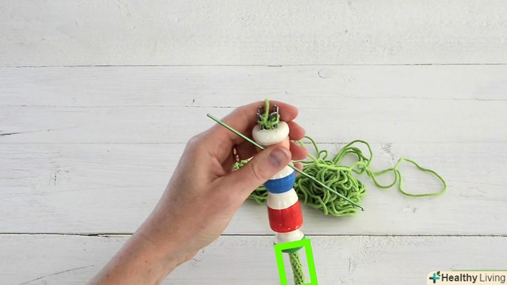 Підготуйте котушку для в'язання. зробіть її самі, встромивши чотири кнопки-гвоздика навколо отвору котушки для ниток.- Витягніть кінець пряжі довжиною близько 20 см і протягніть його через котушку зверху вниз, щоб назовні звисав «хвостик» довжиною 7,5–10 см.