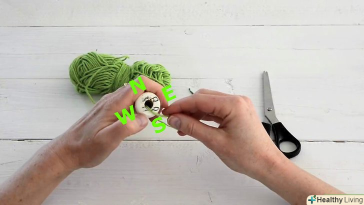 Подумки позначте гвоздики як північний, південний, східний і Західний. Необов'язково, щоб вони співвідносилися з цими напрямками насправді; позначення потрібні, щоб ви не збилися в процесі в'язання і не поміняли раптом північ і схід місцями.- Оберніть пряжу, що йде від клубка, навколо Північного гвоздика за годинниковою стрілкою.