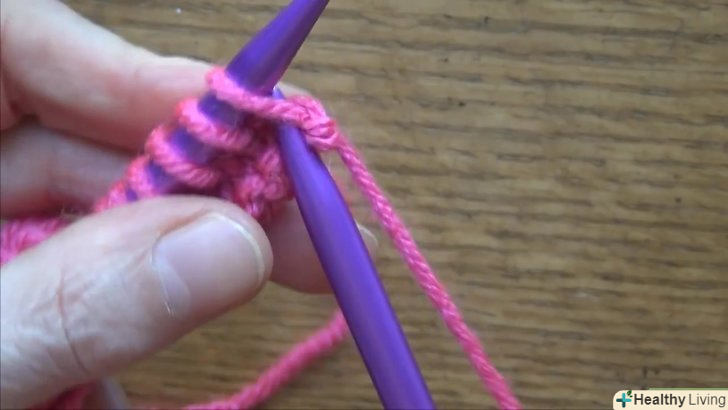 Пров'яжіть виворітну петлю. Тепер ви готові до того, щоб виконати виворітну петлю. Якщо ви тільки вчитеся в'язати, працюйте неквапливо, щоб не переплутати послідовність петель. Після виворітного петлі потрібно знову перекласти робочу нитку. Проведіть її між кінчиками спиць за тильну сторону в'язання. [14]- Чергуйте лицьові і виворітні петлі до самого кінця ряду. щоб зв'язати гумку, необхідно послідовно чергувати лицьові і виворітні петлі до кінця ряду. Потім спиці потрібно поміняти місцями і там, де в попередньому ряду ви пров'язали виворітні петлі, тепер ви будете в'язати лицьові, а там, де були лицьові — виворітні. Пров'яжіть таким чином стільки рядів гумки, скільки вам необхідно для виконання конкретного проекту. [15]