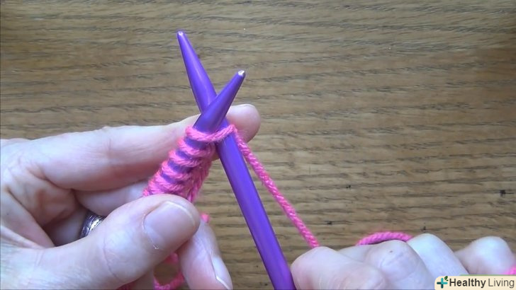 - Пров'яжіть лицьову петлю. візерунок гумки створюється чергуванням лицьових і виворітних петель. Щоб приступити до роботи, почніть з лицьової петлі. Якщо ви тільки вчитеся в'язати, працюйте неспішно. Вам необхідно правильно пров'язувати всі петлі, щоб нічого не переплутати в візерунку. [12]