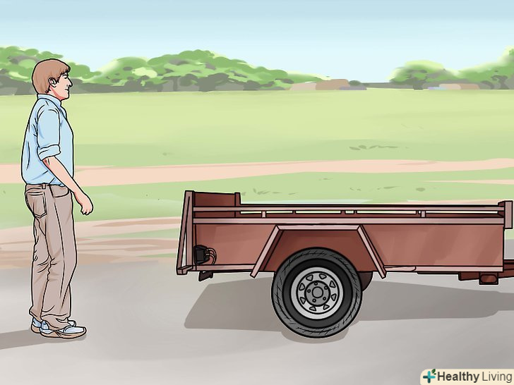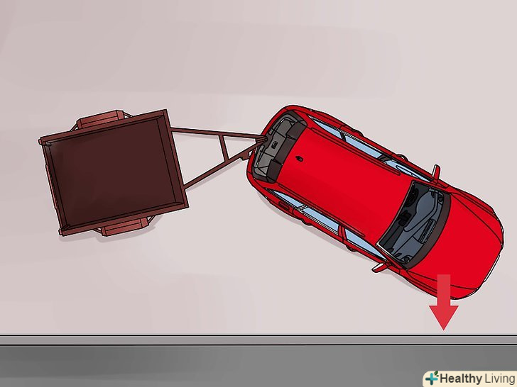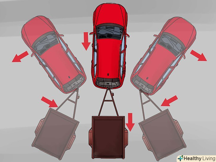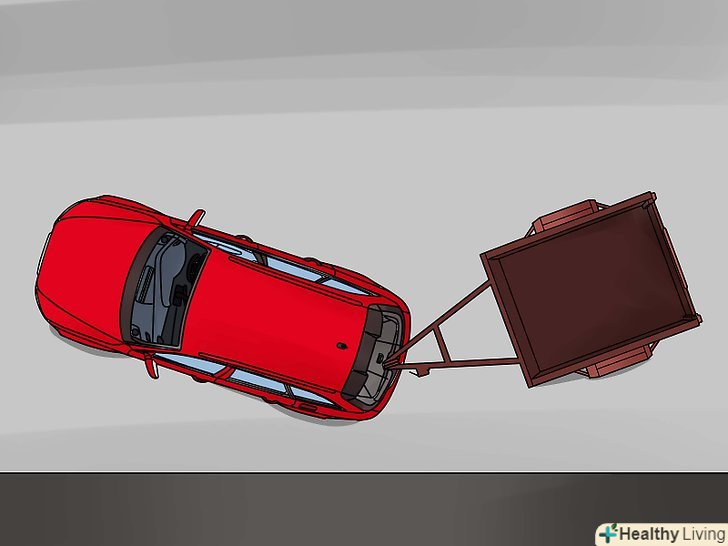 - Уявіть, що задні колеса автомобіля грають роль рульових коліс причепа; тобто, якби у причепа було чотири колеса, то рульовими колесами були б задні колеса автомобіля. Отже, щоб рухати причіп в потрібному напрямку необхідно, щоб задні колеса автомобіля розташовувалися під певним кутом до коліс причепа. Тому спочатку виверніть кермо так, щоб колеса причепа розташовувалися під «правильним» кутом до задніх коліс автомобіля, і тільки потім здавайте назад.