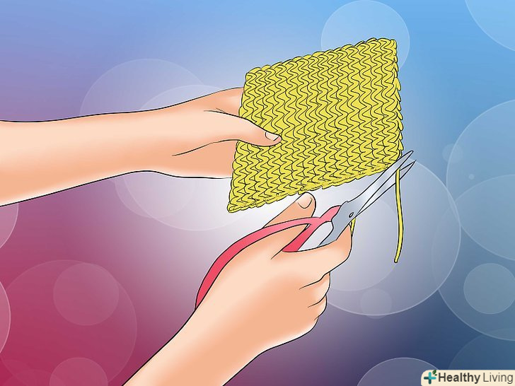 Зв'яжіть останній стібок. досягнувши кінця останнього ряду, обріжте пряжу, залишивши звисати приблизно 10 см на кінці. Гачком витягніть цей кінець пряжі через останню петлю на гачку, завершуючи цим в'язання.- Вплетіть будь-які надлишки пряжі в стібки, щоб приховати їх.