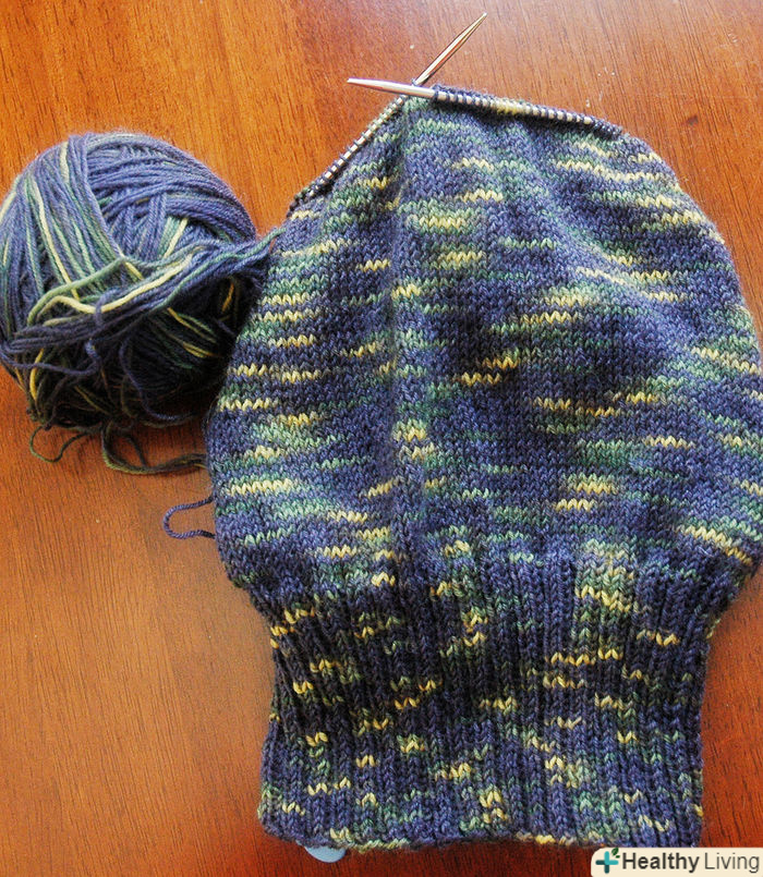 - при в'язанні панчішної в'язкою по колу виходить м'який закручується край. Якщо ви хочете зробити край шапочки, рукавичок або шкарпеток більш еластичним, зв'яжіть його гумкою.Бере з гумкою по краю