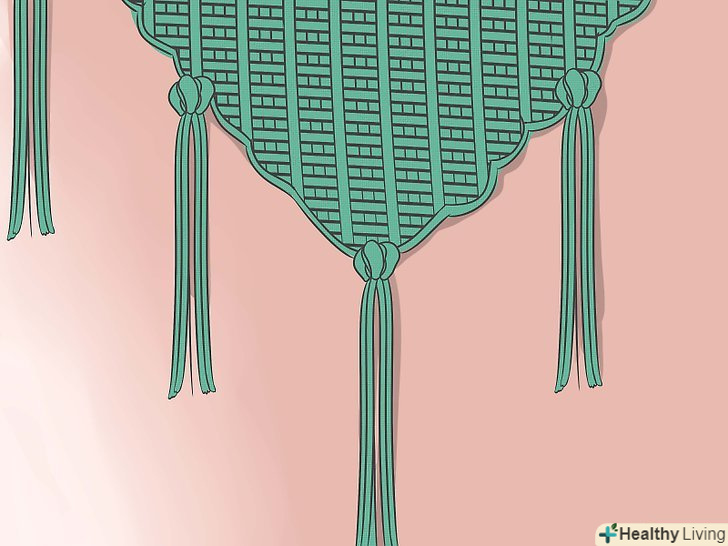 Прикрасьте шаль бахромою. наріжте пряжу на шматочки однакової довжини. Вирішіть, чи будете ви робити бахрому в одну нитку або в кілька. У відповідність з цим складіть шматочки пряжі вдвічі по одному або по кілька. Введіть гачок в першу петлю нижнього краю шалі. [7]- Захопіть складену нитку гачком і простягніть крізь в'язане полотно, не до кінця.