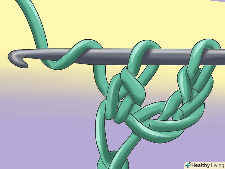 Пров'яжіть ряд стовпчиків за своїм вибором по всій довжині ланцюжка. слідкуйте, щоб всі стовпчики були однакового розміру. Виберіть такий тип стовпчиків, який вам найлегше вдається, або який, на ваш погляд, найкраще підійде для вашої прямокутної шалі. [5]- Стовпчик з накидом відповідний базовий елемент. Знайдіть п'яту повітряну петлю початкової ланцюжка. Накиньте нитку на гачок. Введіть гачок в четверту від нього петлю ланцюжка. Візьміть нитку гачком і витягніть. На гачку вийде три петлі. Знову захопіть нитку і витягніть її через перші дві. На гачку залишаться дві петлі. Візьміть нитку гачком і витягніть її через обидві залишилися петлі.