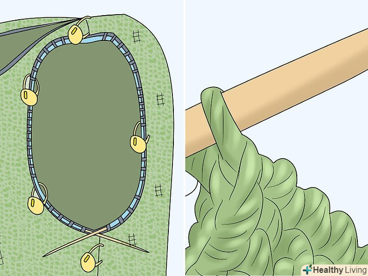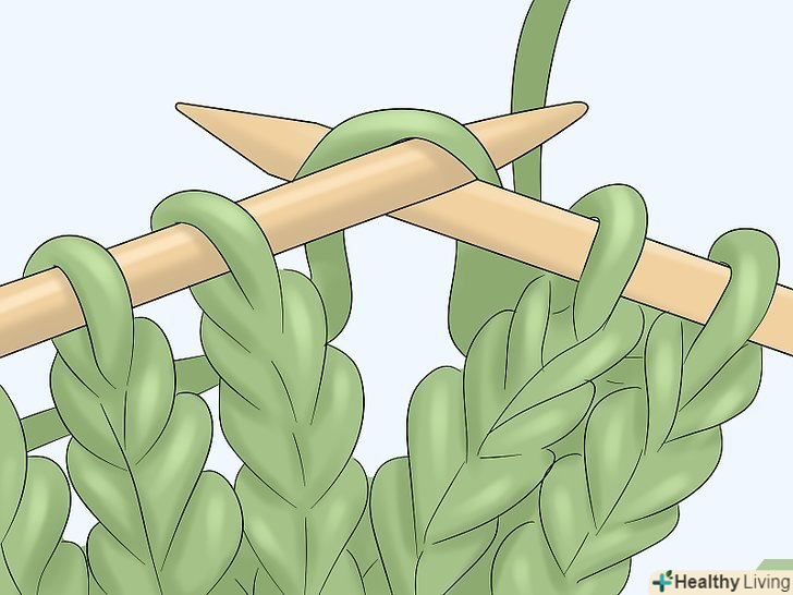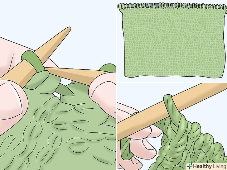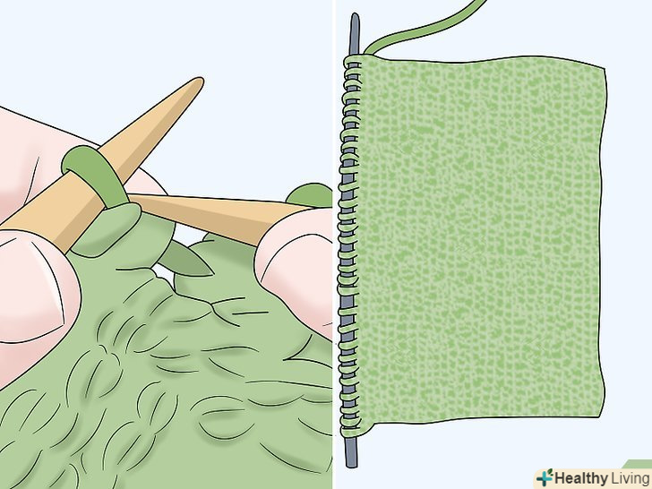 Перейдіть на спиці розміру 10 (6 мм) і продовжите в'язати лицьовій гладдю. через 6 рядів почніть наступний ряд спицями розміру 10. Потім почніть в'язати лицьовій гладдю . Продовжуйте поки не зв'яжіть шматок довжиною 38 см. [7]- Для лицьової гладі чергуйте ряди з лицьовими і виворітними петлями. Наприклад, пров'яжіть перший ряд лицьовими петлями, потім другий ряд — виворітними, потім знову лицьовими і т. д. [8]