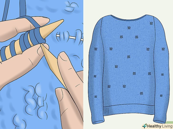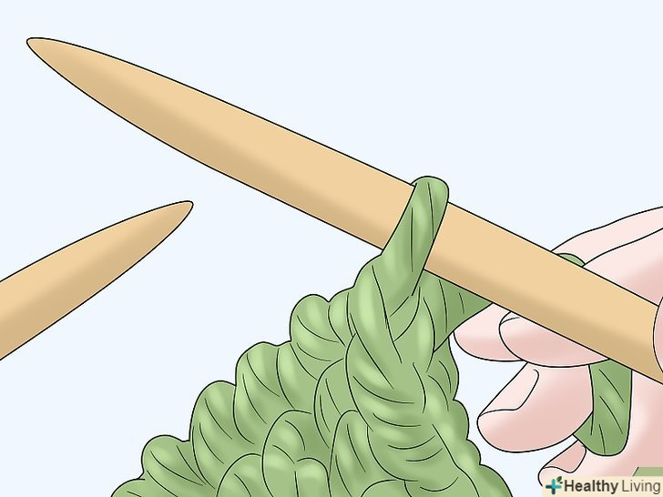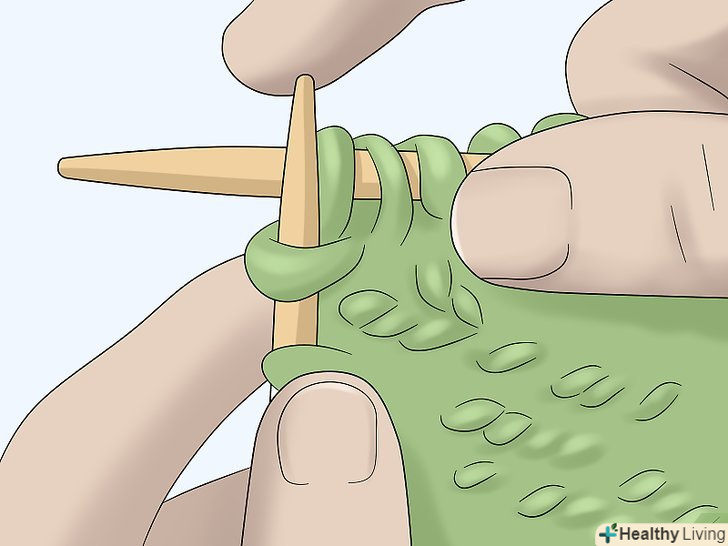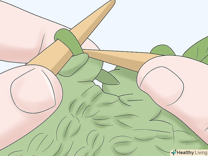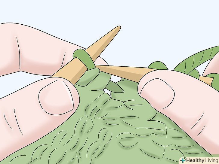 Додайте петлі. при в'язанні рукава потрібно буде додати петлі. Так ви забезпечите розширення рукава при пров'язуванні його до з'єднання з плечем. Почніть додавати петлі приблизно після 30 ряду. Потім додавайте по 1 петлі у кінцевій петлі кожен четвертий ряд.- Щоб додати петлю в'яжіть лицьову петлю, як зазвичай, але не перекидайте її на другу спицю. Пров'яжіть через цю петлю ще одну знову, ввівши спицю не спереду, а ззаду петлі. Потім зніміть петлю: замість 1 з неї тільки що з'явилося 2 нових. [15]