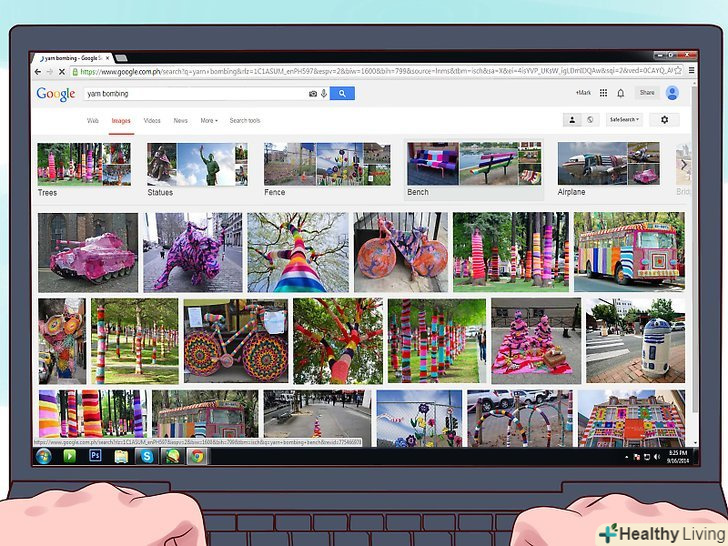 Знайдіть ідеї. Якщо Вуличне в'язання поширене у Вашому місті, ви можете надихнутися роботами місцевих художників. Якщо там, де ви живете, об'єкти ярнбомбінгу зустрічаються рідко, ви можете пошукати ідеї на фотографіях в Інтернеті. [1] [2]- Популярні Тривимірні об'єкти включають дерева, дорожні знаки та статуї. З об'єктів більш дрібного масштабу можна спробувати камені або соснові шишки.