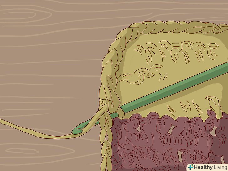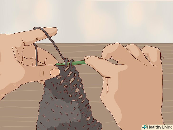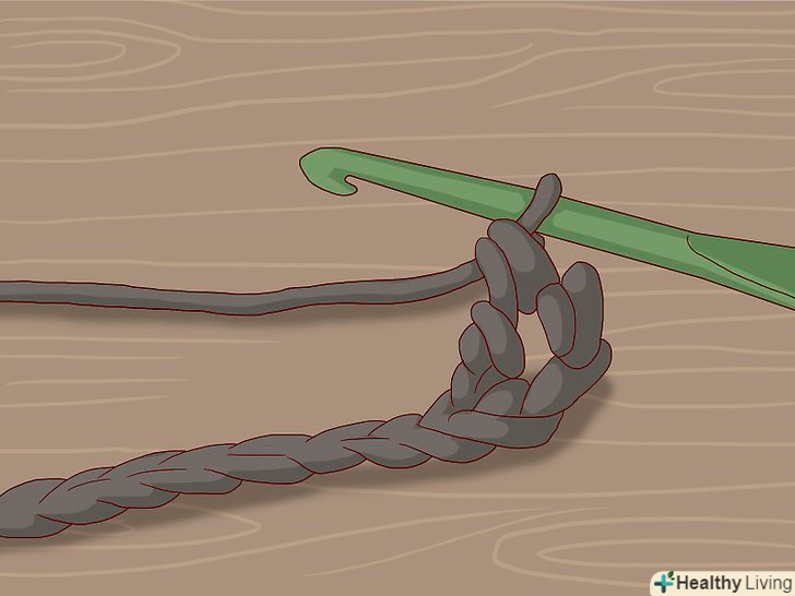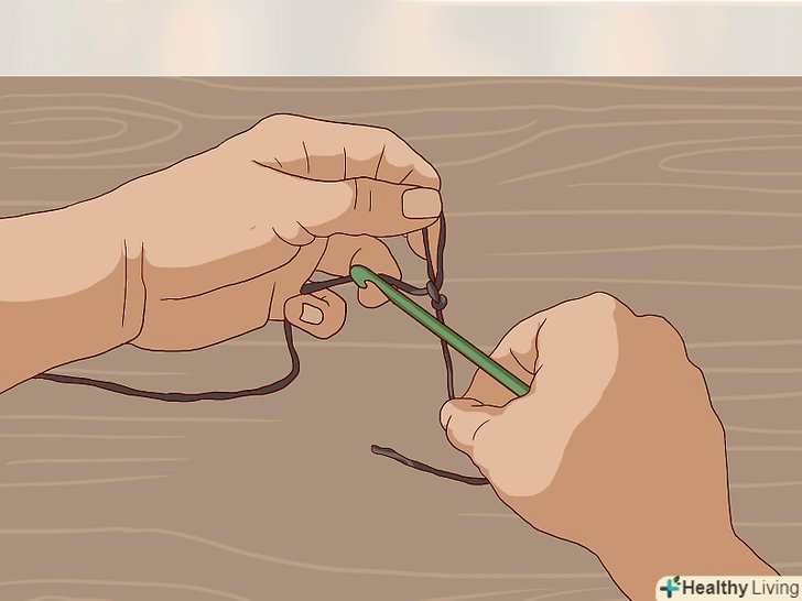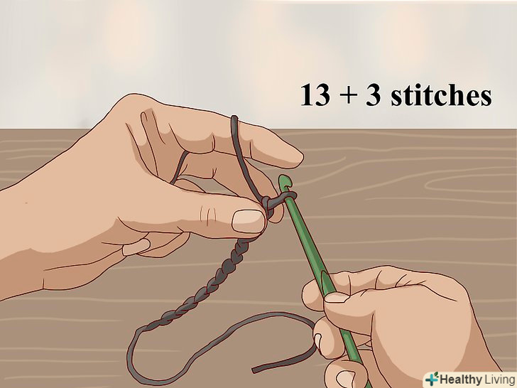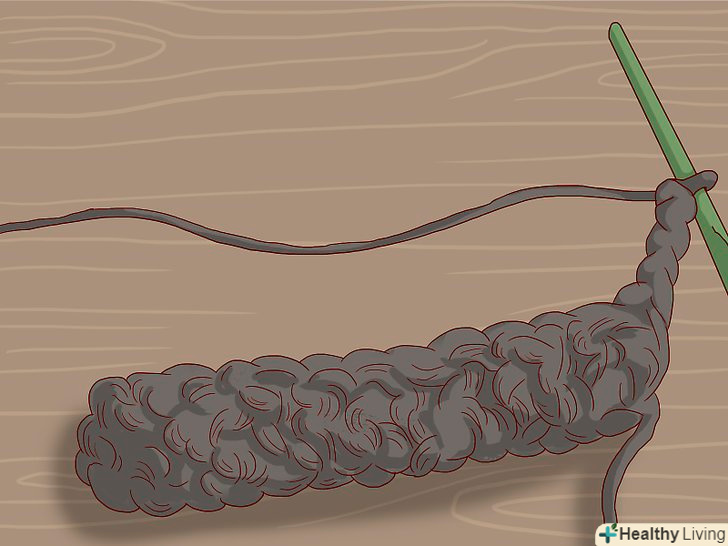 Наберіть ланцюжок з 13+3 повітряних петель. щоб зв'язати ланцюжок з повітряних петель , накиньте робочий кінець пряжі на гачок перед ковзаючим вузлом, а потім витягніть петлю пряжі через ковзний вузол – це і буде ваша перша повітряна петля. Наберіть 13 таких же петель і ще 3, щоб в цілому вийшло 16 повітряних петель. [3]- Додаткові три повітряні петлі-це петлі підйому. Петлі підйому дають трохи місця, щоб можна було розгорнути в'язання і почати новий ряд. Поки ви не закінчите шарф, вам потрібно буде в'язати по 3 петлі підйому для кожного нового ряду.