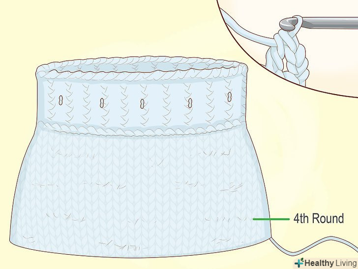 Зв'яжіть стовпчик з накидом через другий круговий ряд. Зв'яжіть три повітряні петлі, потім один стовпчик з накидом в кожному окремому стовпчику з накидом попереднього ряду. Закріпної петлею зчепите разом першу і останню петлі.- Закінчивши друге коло, розташуйте 6 міток для в'язання рівномірно по колу. Тобто, приблизно кожні 23 петлі для тонкої, 25 петель для середньої, 26 петель для широкої, і 27 петель для дуже широкої талії.