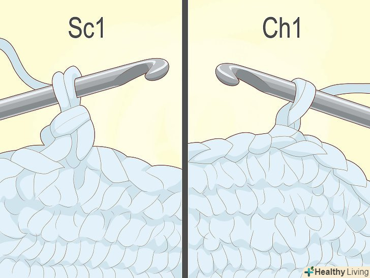 Зв'яжіть повітряну петлю і один стовпчик без накиду на початку наступного кругового ряду. Зв'яжіть повітряну петлю, потім один стовпчик без накиду в першій петлі попереднього кола.