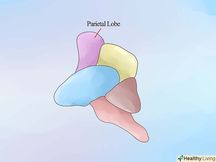 Додайте тім'яну частку. Візьміть фіолетову глину і сформуйте ще один прямокутник, трохи більший, ніж жовтий. Притисніть його до лівого краю потиличної частки і перевірте, що нижня частина прилягає до скроневої частки.- Коли частка буде на місці, за допомогою своїх пальців зігніть зовнішній/верхній край так, щоб він був продовженням природного вигину потиличної частки.