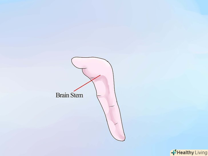 Сформуйте стовбур мозку. скачайте з червоної глини коротку ковбаску. Стискайте і розгладжуйте ковбаску своїми пальцями до тих пір, поки верхня її частина не почне закручуватися вгору і вліво, тоді як нижня частина стоншиться і загнеться вправо. Нижня частина повинна мати загострений кінчик, а верхня – плоский; і бути дещо товщі.- Стовбур мозку відповідальний за автоматично функції і системи вашого тіла.