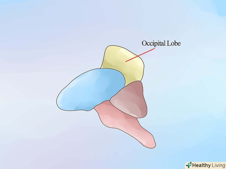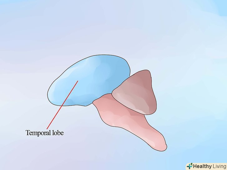Зліпите скроневу частку. Відщипніть шматок синьої глини приблизно того ж розміру, що і червоний. Скачайте і розплющіть його в овал. Розмістіть його так, щоб середина нижнього краю стосувалася верхньої частини лівого боку стовбура мозку. Один кінець скроневої частки повинен доходити приблизно до середини верхнього краю мозочка.- Скронева частка контролюють слух і пам'ять.