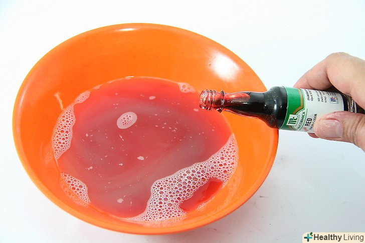 Підготуйте трохи оцту. і додайте туди червоний харчовий барвник. А щоб лава ще й пузирилася, то додайте туди чайну ложку засобу для миття посуду.